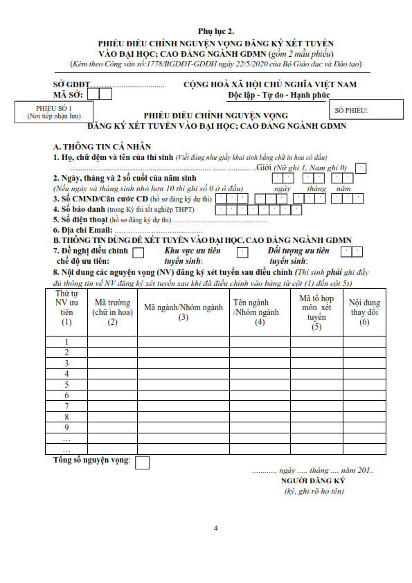 - Có hai mẫu phiếu điều chỉnh nguyện vọng giống nhau. Thông tin điều chỉnh ĐKXT được khai trên 02 phiếu (Phiếu số 1 Nơi tiếp nhận lưu, Phiếu số 2 Thí sinh lưu). Tải về mẫu phiếu điều chỉnh NV TẠI ĐÂY